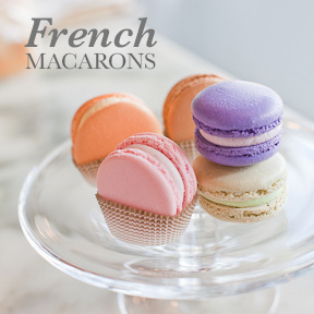 - French macarons in caramel, chocolate, pistachio, and vanilla…$1.50 each